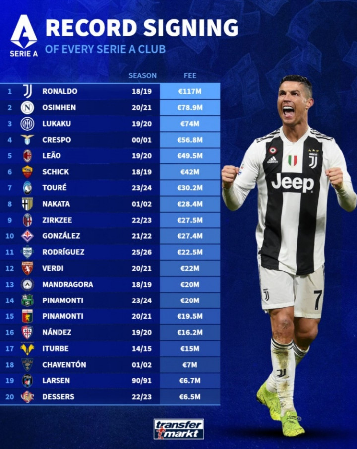 意甲各队标王: 尤文1.17亿欧签C罗第一 奥斯梅恩、卢卡库二三位